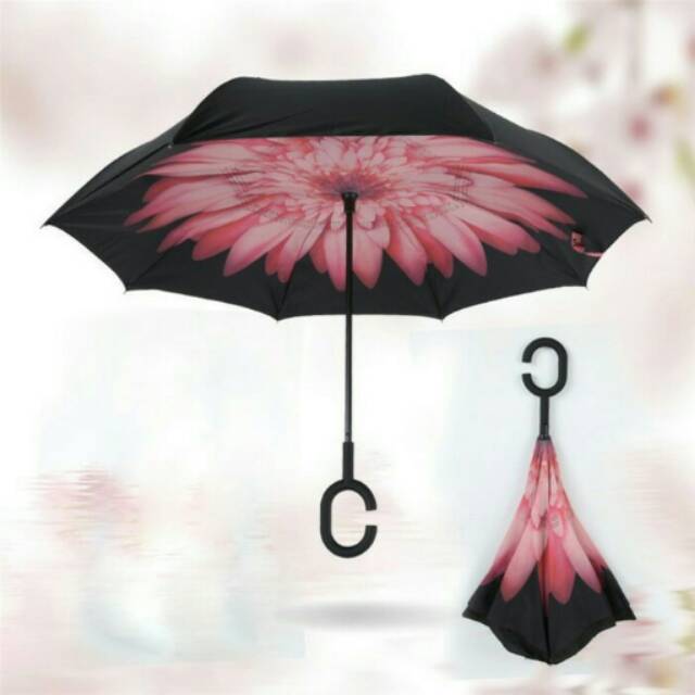 Perhatian: Karena konstruksi payung terbalik rangka nya terbalik, pada saat membuka cenderung mengarah ke atas, jadi harus dibantu manual/atau dihentakkan agar membentuk mangkok.