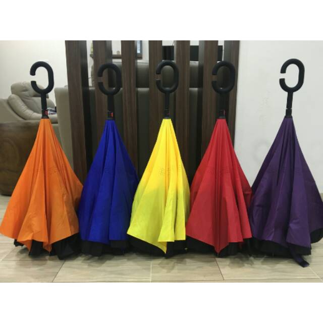 Desain yang unik dengan arah terbalik. Berbeda dengan payung yang biasanya. Fungsi utama dari payung ini agar Anda tidak terkena hujan pada saat keluar atau masuk mobil.