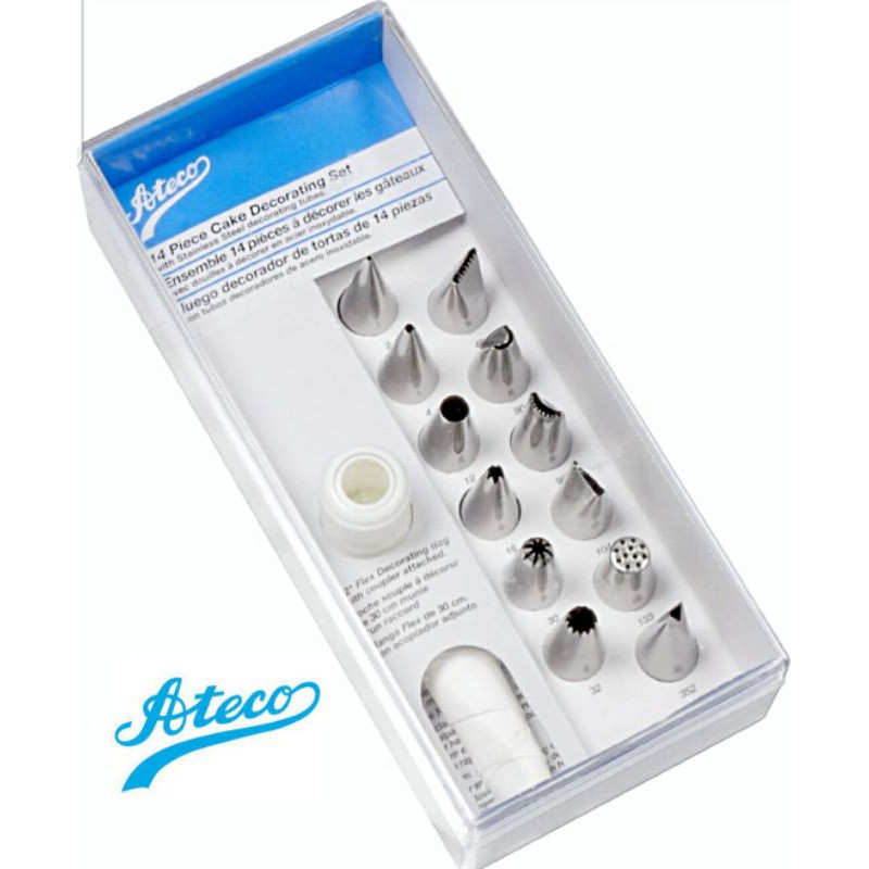 Set komplit 14 pcs spuit Ateco ori made in Korea. Spuit idaman dan wajib bagi pecinta dekorasi kue. Produk ori impor korea. Set 14 ocs terdiri dari 12 pcs spuit, 1 piping bag dan 1 pcs konektor spuit dan box penyimpanan. Spuit terbuat dari stainless steel, tanpa sambungan, memiliki nama Ateco di body spuit dan memiliki nomor serial.
