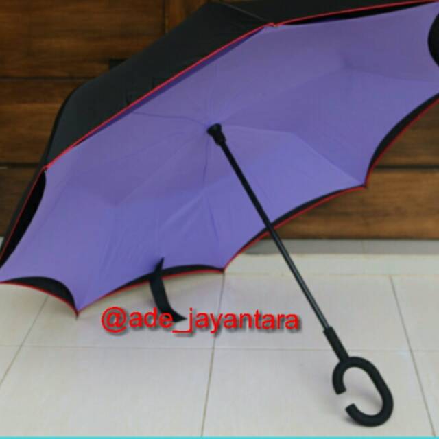 Payung ini berbeda dengan payung terbalik yang telah beredar di pasaran dengan rangka payung yang terlihat sehingga terkesan kurang bagus. Rangka payung yang ini tidak terlihat sehingga lebih menarik lagi. Harga PROMO... harga sama dengan payung model single layer.