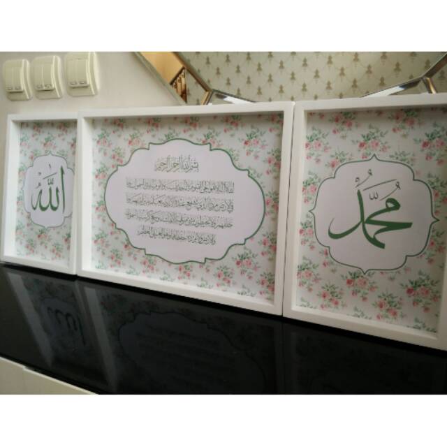 Name: Pajangan Lulisan Kaligrafi Set Ayat Kursi Dan Allah Muhammad Shabby Chic Hijau Tosca Frame Putih